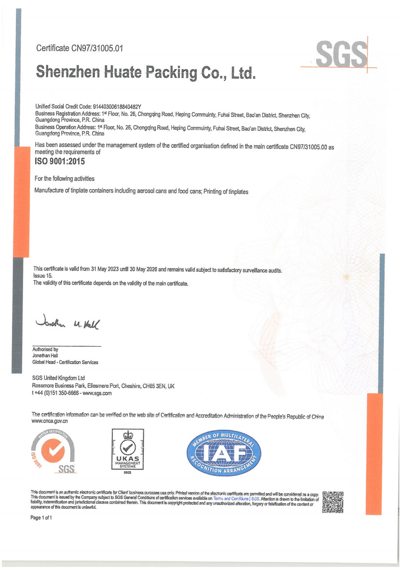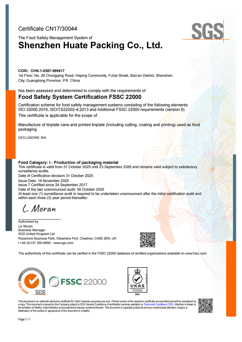As a food brand expanding into new markets, we needed food-grade cans with precise easy-open ends and vibrant lithography. The team Shenzhen Huate factory worked closely with our designers from the first proof to final production. No issues with sealing or food safety certifications—great partner for custom food tins